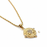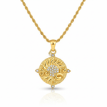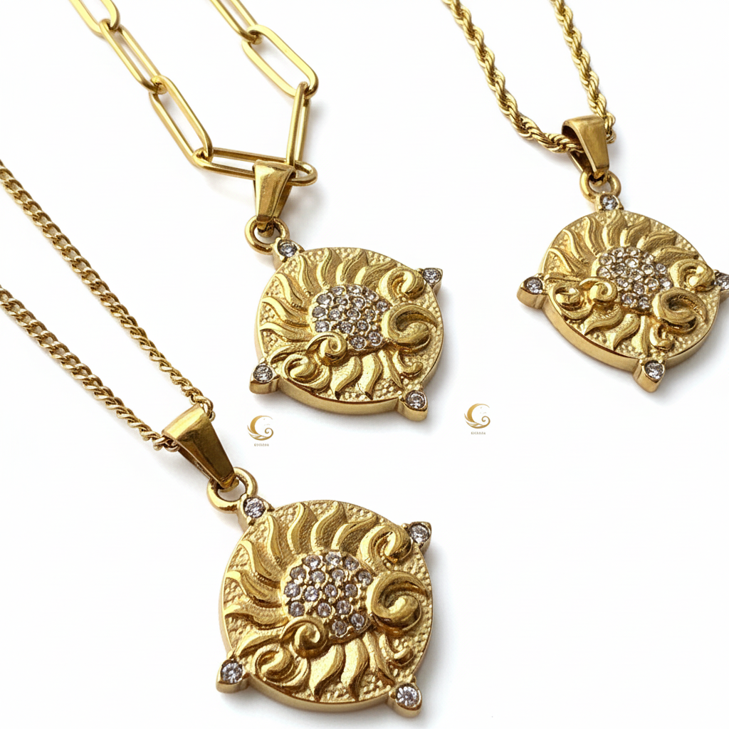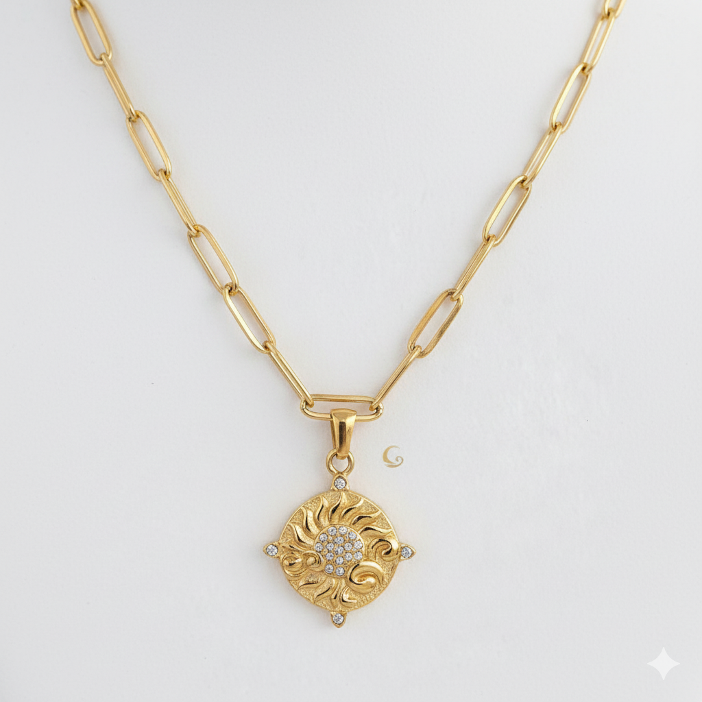 Unit price perThey say the sun never truly sets—it simply travels to light another soul. Soleia was made to carry that light close to your heart. Inspired by golden days and ancient skies, this necklace holds the warmth of a thousand dawns. An antique-style medallion, sculpted like a rising sun and kissed with gentle sparkles, reminds you that your inner glow is eternal.
